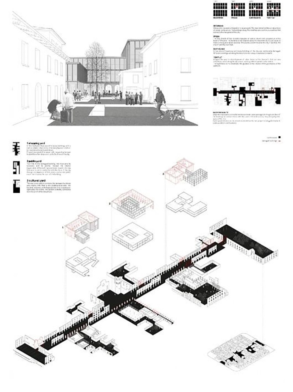 • یک رندر خارجی دید پرنده و چندین رندر داخلی و خارجی برای معرفی بهتر بنا